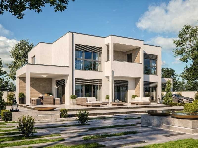 Unser Haus Sydney ist ein imposantes Haus in kubischer Flachdacharchitektur. Große Glasfronten und klare, markante Formgebung sind prägend für die Ästhetik dieses Anwesens. Anbauten wie Carport, überdachte Terrasse und Loggia setzen formschöne und gleichzeitig nützliche Akzente. Auffallend weitläufig und repräsentativ beeindruckt der über 63 m² große Raumkombination von Kochen, Essen und Wohnen, in dem ein eigener Bereich zum gemütlichen Relaxen zur Verfügung steht. Eine überdachte Terrasse verbindet Haus und Garten - ein schattiger Platz, an dem man auch bei einem warmen Sommerregen in der Natur entspannen kann.