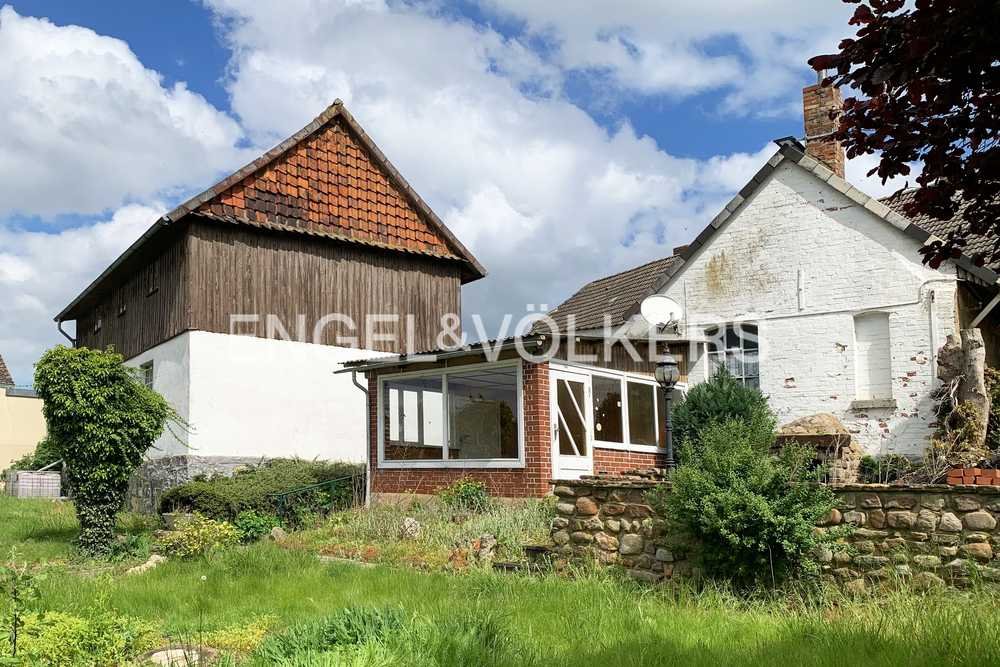 Hinter diesem Gebäude liegt der große Garten in leichter Hanglage, der einen schönen Blick zum Elm bietet. Hier befindet sich auch ein kleines Gartenhaus mit Terrasse, das als Partyraum genutzt wurde.