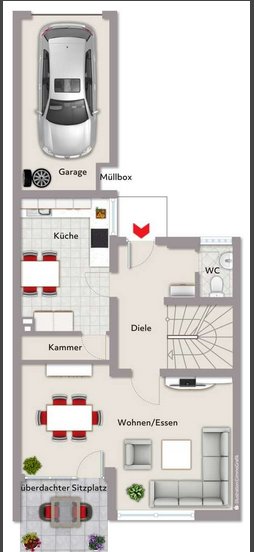Zu dem Haus gehört eine Garage und ein Stellplatz vor dem Haus.