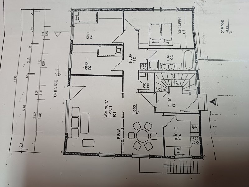 Im Erdgeschoss: 3 Schlafzimmer, großer Wintergarten der ganzjährig benutzt werden kann. Küche mit E Geräten, Ess und Wohnzimmer , die durch eine offene Fachwerkwand verbunden sind und so ein offenes Raumkonzept entsteht. Vorratskammer. Bad mit Dusche.