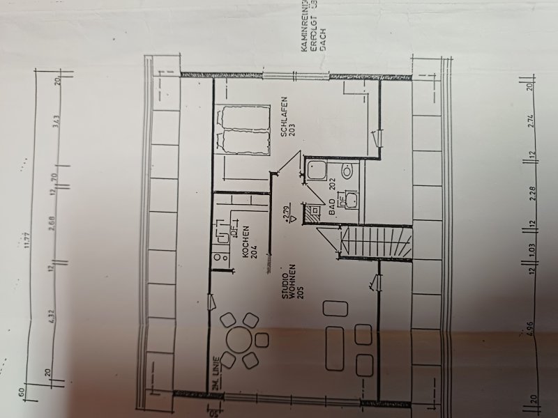 Dachgeschoss: Wohn-Esszimmer, Küche mit E Geräten, Bad mit Eckwanne, Schlafzimmer mit begehbarem Kleiderschrank.