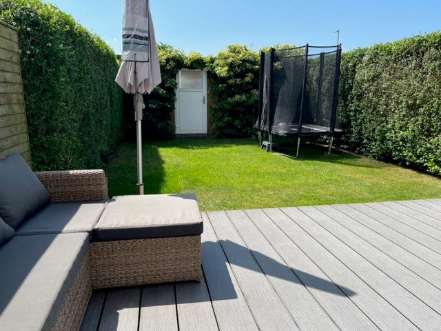Ebenso ist hier der große Wohn- und Essbereich von wo aus man auch in den nach Westen ausgerichteten Garten kommt. Hier befindet sich eine neuwertige Terrasse aus WPC-Terrassendielen.