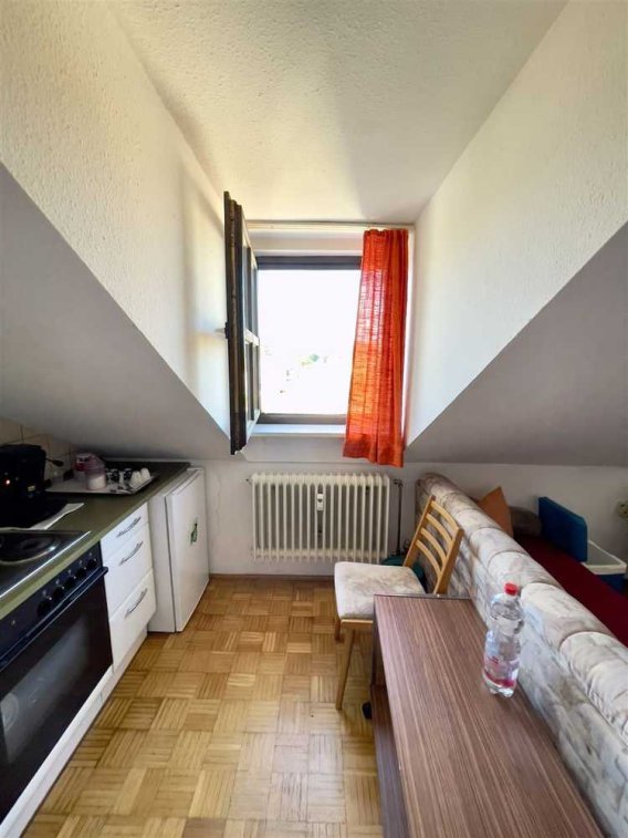 Die ca. 24 m² des Apartments sind aufgeteilt in Flur und Wohn- und Schlafraum. Hier findet sich ausreichend Platz für das Nötigste. Die Fenster sorgen für natürliches Licht und eine freundliche Atmosphäre, die Dachschrägen sorgen für Gemütlichkeit. Die Küchenzeile ist mit einfachen Einbauschränken und Geräten ausgestattet. Das Badezimmer ist zweckmäßig eingerichtet und verfügt über eine Dusche, Waschbecken und WC.