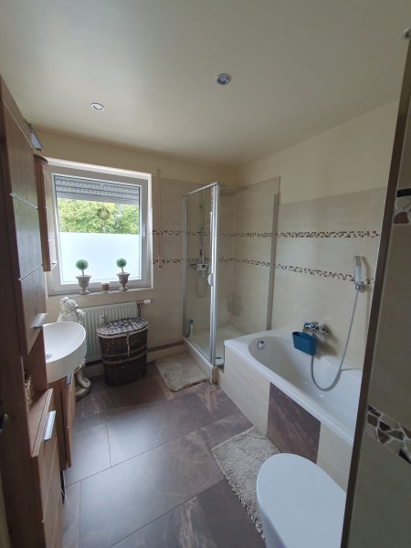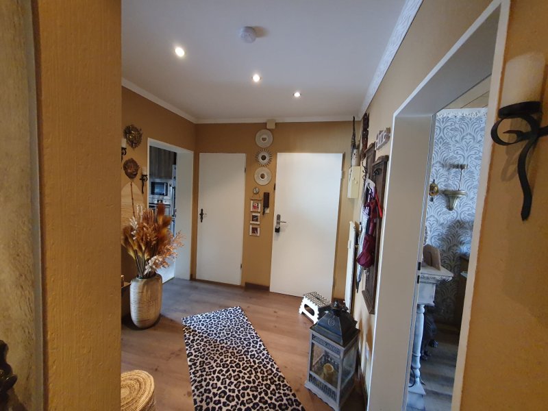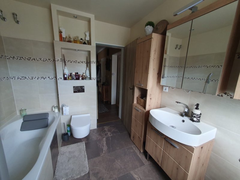 Wohnung im 1. OG eines Hauses mit 5 Eigentumswohnungen. 3 Zimmer (Wohnzimmer, Gäste-/Kinderzimmer, Schlafzimmer), Küche (mit Einbauküche aus dem Jahr 2022), Badezimmer (mit Dusche, Badewanne, WC und Waschtisch), Gäste-WC, Flur, Abstellraum und Balkon mit einer Wohnfläche von 83 m2. Zur Wohnung gehört eine Garage und ein in zwei Räume unterteilter Kellerraum. Es steht außerdem ein Gemeinschaftswaschkeller sowie ein gemeinschaftlicher Trockenraum zur Verfügung.