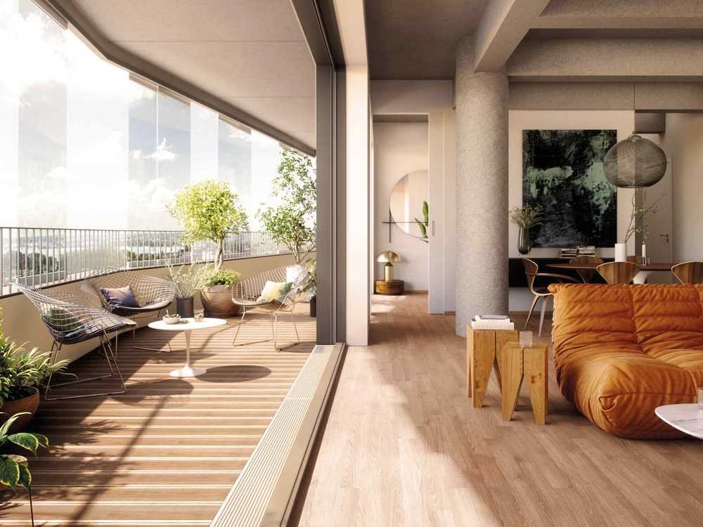 Die hohen Innenräume werden zu modernen Lofts mit offenen Wohnbereichen ausgebaut. Somit bleibt die Grundstruktur des Gebäudes mit seinen runden Betonstützen und Decken mit offenen Unterzügen erhalten – dies gibt den Räumen durch ihre Weite eine besondere Wirkung. Großzügige Fensterfronten lassen das Tageslicht in die Räume strömen und schaffen ein Zuhause mit Offenheit, Helligkeit und einer wertigen Innenausstattung. Die geschwungenen Balkone erweitern den Wohnbereich nach außen und können größtenteils mit einer Schiebeverglasung zu ca. zwei Dritteln windgeschützt geschlossen werden.