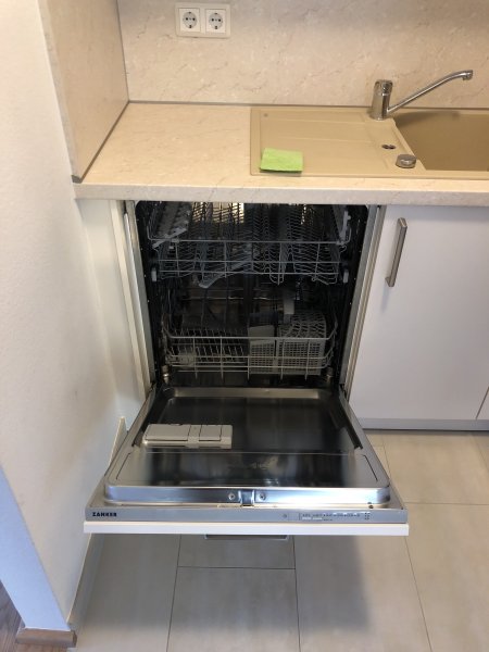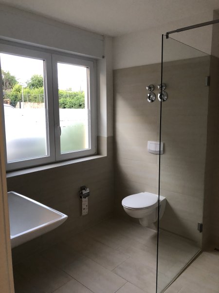 Das Bad ist vollständig gefliest und mit einer bodengleichen Dusche ausgestattet. Die Armaturen sind allesamt Markenfabrikate.