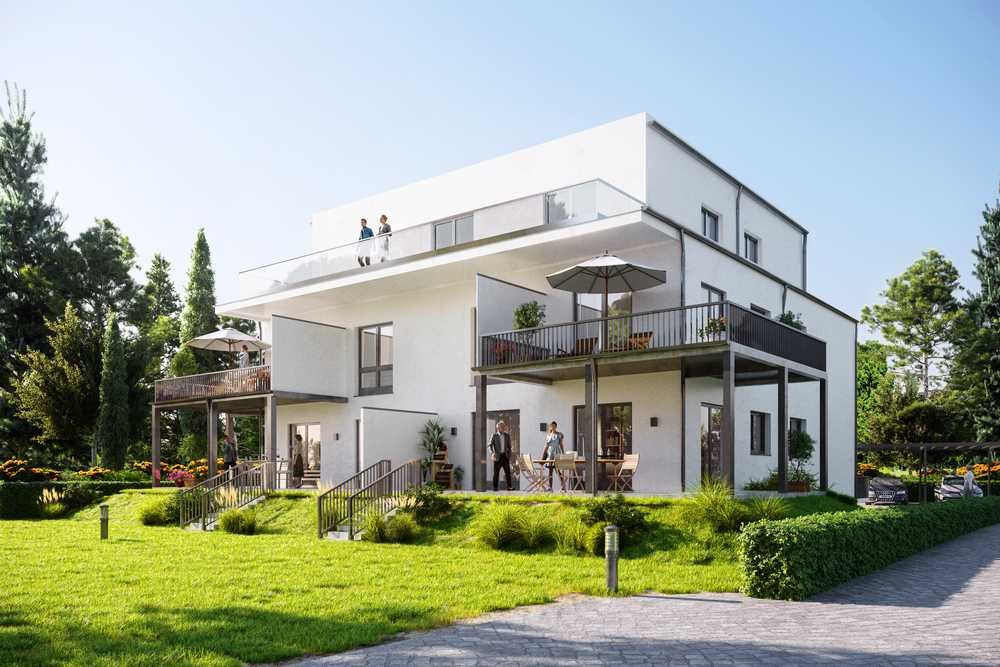 Balkone. Die moderne Architektur besticht durch großzügige Fensterflächen, luftige Raumhöhen und eine optimale Raumstruktur mit offener Wohnküche und Essbereich.