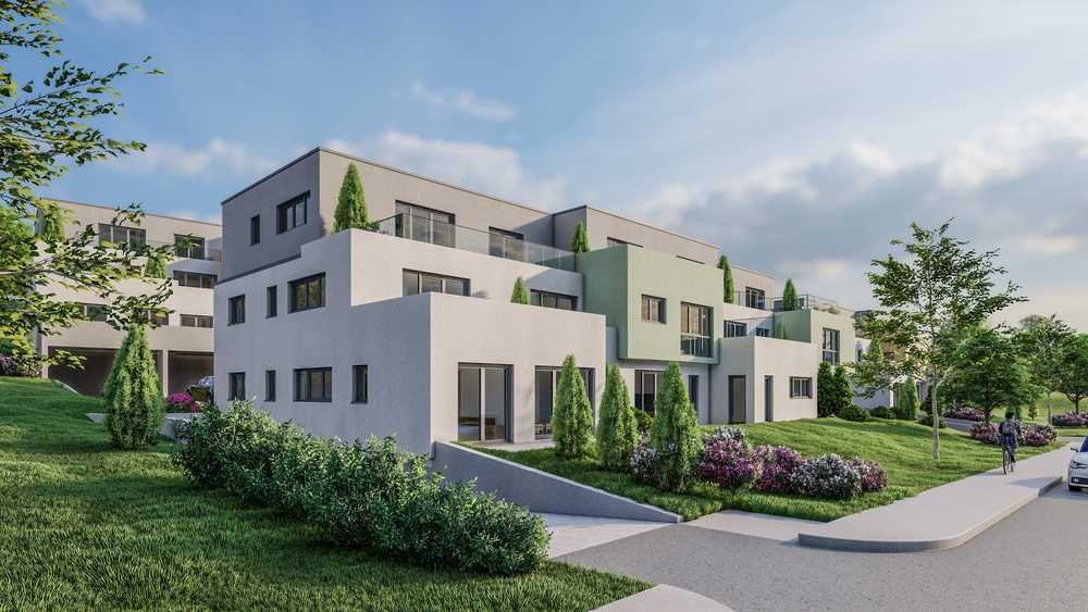 Das Objekt besteht aus 4 Gebäudeteilen, die terrassenförmig angelegt sind. Das Haus 2 befindet sich auf der linken Seite, unten. Eine ansprechende Architektur mit heller Fassade und bodentiefen Fenstern sorgen für ein modernes und einladendes Erscheinungsbild. Zu den optischen Highlights des Neubaus gehören auch das begrünte Flachdach und die großzügig angelegten Balkone und Terrassen.