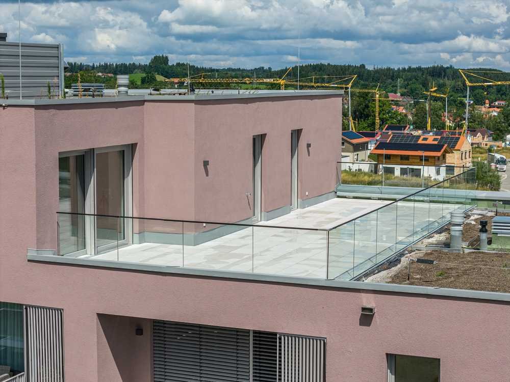Das horizontal aufgegliederte Gebäude, mit insgesamt 21 Eigentumswohnungen, fügt sich architektonisch und emotional bestmöglich in die bestehende Hangsituation ein. Durch die exponierte Lage des Gebäudes im Gesamtgebiet und die Ausbildung von großzügigen Terrassen und Balkonen ergeben sich einzigartige Sicht- und Blickbeziehungen zum Stadtgebiet Kempten und dem dahinterliegenden Alpenpanorama.