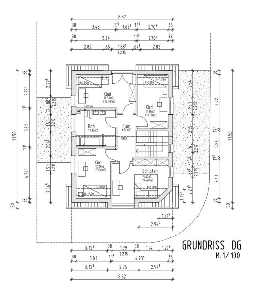 Obergeschoss:Im Obergeschoss befinden sich vier ebenfalls zugeschnittene Schlafzimmer von ca. 65,26m².Hinzu kommt ein Badezimmer von 11,35 m² mit doppeltem Waschbecken, Dusche, WC und freistehendem Badewanne.