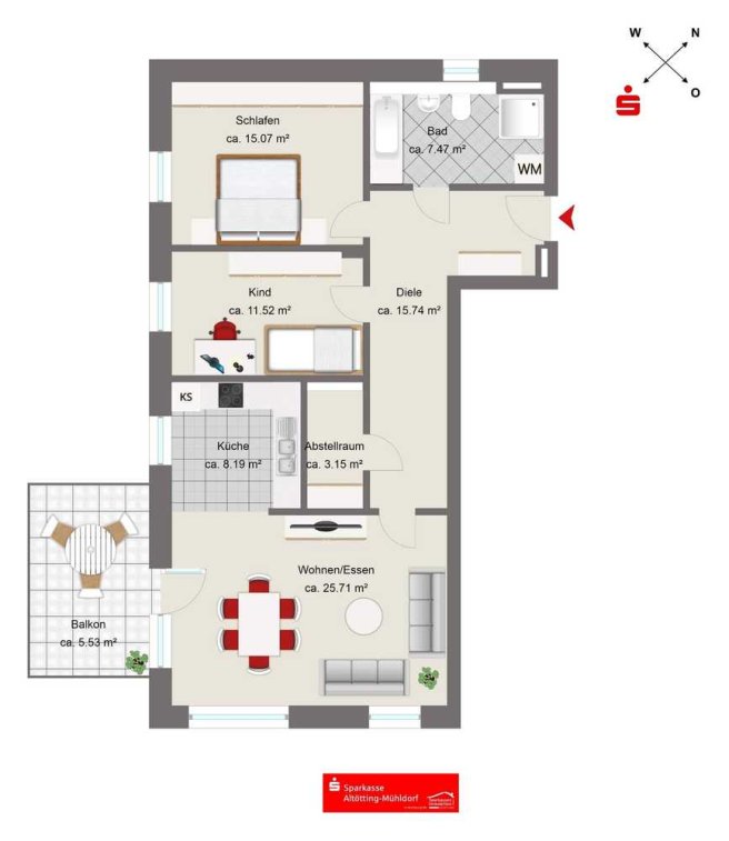 Zur Rechten befindet sich das Familienbad mit Badewanne, Dusche und Waschmaschinenanschluss. Anschließend folgen das Schlafzimmer und das Kinderzimmer. Aus der Diele gelangen Sie ebenfalls zum Abstellraum – perfekt für zusätzlichen Stauraum in Ihrer Wohnung! Angrenzend folgt die offene Küche. Über den hellen Wohn-/Essbereich gelangen Sie auf Ihren Balkon.