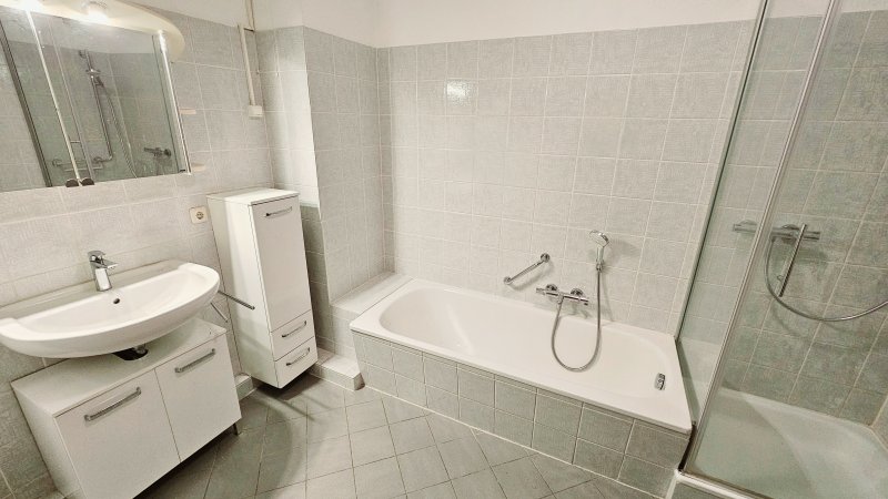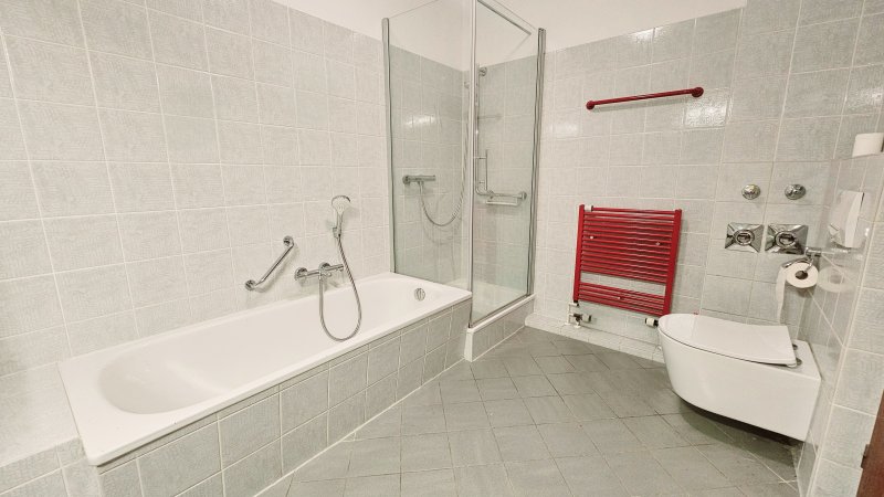 Badewanne und Dusche, besticht durch Fußbodenheizung und