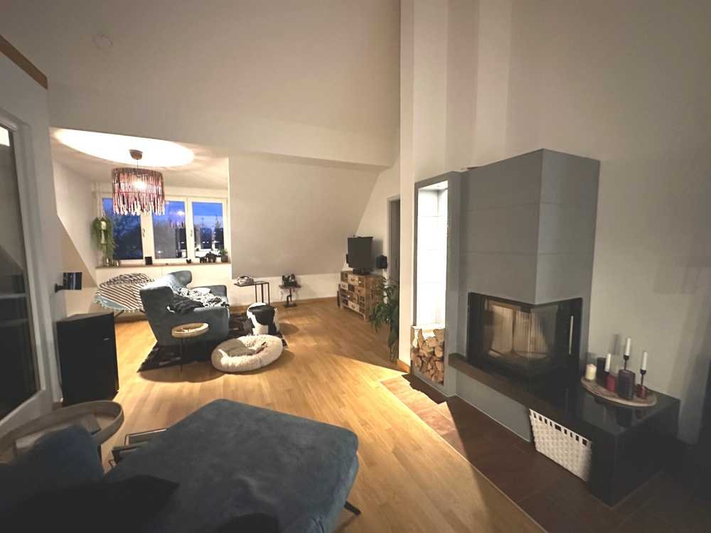 Das Wohnzimmer verfügt über eine geräumige, überdachte Terrasse und eine Deckenhöhe von ca. 5,50 m, die ihm einen Loft Charakter verleiht. In der zweiten ebene des Wohnzimmers, führt eine kleine Treppe auf die Galerie, die dem Raum nochmal was einzigartiges gibt. Ein schöner Kamin sorgt für Gemütlichkeit und Wärme.