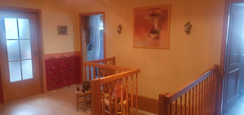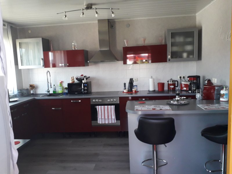 Alle Räume sind mit Laminat verlegt. DasTageslichtbad mit Wanne und Dusche ist komplett gefliest, große EBK L- Form u. zus. Theke,