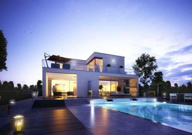 Das ca. 13,50 m x 16 m große Musterhaus bedient sich klarer Formensprache. Der offene Wohn- und
