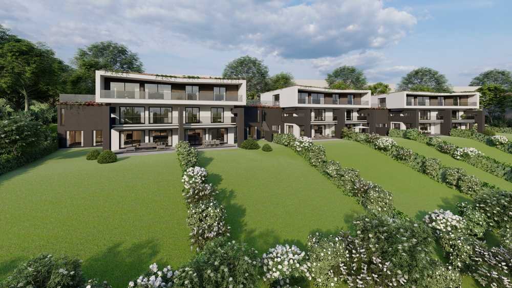 Sonnige Balkone und großzügige Gärten schmiegen sich in das klare Design mit eleganter Fassade und charakteristischen Glasflächen.