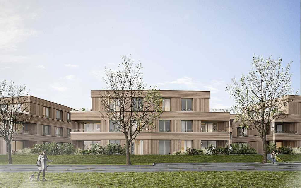 Das Gebäudeensemble „In den Hofwiesen“ beeindruckt mit seiner markanten Architektur und der individuellen Holzfassade. Die interessanten Kuben der Gebäude mit ungewöhnlicher Geometrie verleihen dem Projekt einen ganz individuellen Charakter und schaffen gleichzeitig einen von Privatheit geprägten, attraktiven Innenhof, von dem aus die Gebäude erschlossen werden.