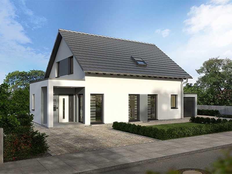 Die Hausarchitektur überzeugt mit Modernität und vielen Details. Die Garage schmiegt sich ans Gebäude an. Hinter der Garage entsteht ein behaglicher, geschützter Terrassenbereich. Die Wohnraumerweiterung im Erdgeschoss setzt sich in einer Terrassenüberdachung fort. Durch die Planung eines Nebeneingangs, kann die Garage auf kürzestem Weg vom Hauswirtschafts-/Haustechnikraum aus betreten werden. Der moderne Hausentwurf bietet auf 170 m² Grundfläche viel Platz für die gesamte Familie. Der Wohn-/Ess- und Kochbereich öffnet sich über 2 große Panorama-Hebeschiebetüren, 2 Terrassentüren und ein bodentiefes Fensterelement zur Terrasse und zum Garten hin. Der Kochbereich kann mit einer Kochinsel ausgestattet werden. Vier Schlafräume, davon einer mit einer separaten Ankleide, und zwei Bäder bringen Wohnkomfort ins Familienleben.