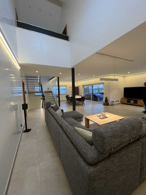 Das schicke Haus ist im 1. OG sehr weitläufig und offen gestaltet. Hier kann bei Bedarf durch den Einzug von Wänden ein weiteres Zimmer geschaffen werden. Es gibt zum Verweilen sowohl einen großen überdachten sowie beleuchteten XL-Balkon und auch einen schönen Garten.