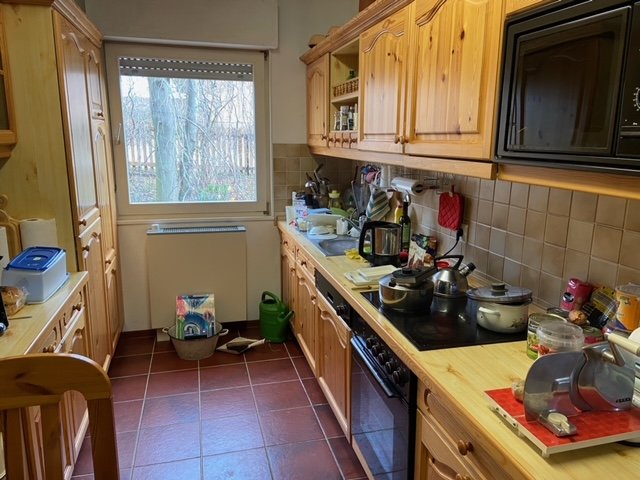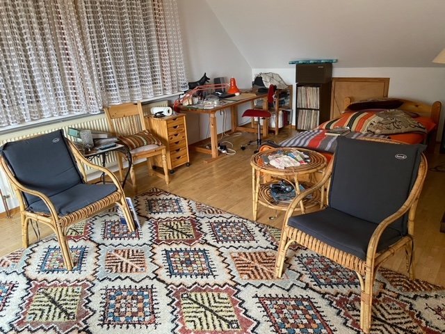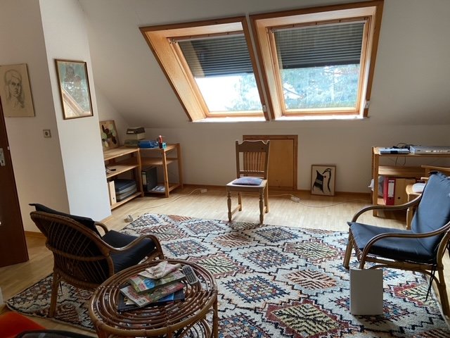 Im DG stehen ein großes Zimmer, das sich als Atelier oder Studio ideal eignet, sowie ein kleineres Zimmer zur Verfügung. Die Einbauküche im EG verfügt über eine Geschirrspülmaschine, Elektroherd mit Ceran-Platte, Mikrowelle, Kühlschrank und Gefriertruhe.