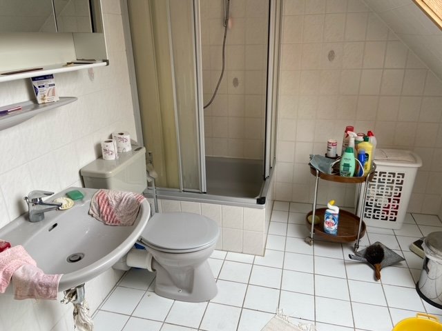 Das Bad im Erdgeschoss ist mit Badewanne und WC ausgestattet, das Bad im Dachgeschoss mit Dusche und WC. Das Haus ist im EG mit einem großen Wohn- und Esszimmer, einem kleineren Zimmer und einer geräumigen Küche ausgestattet.
