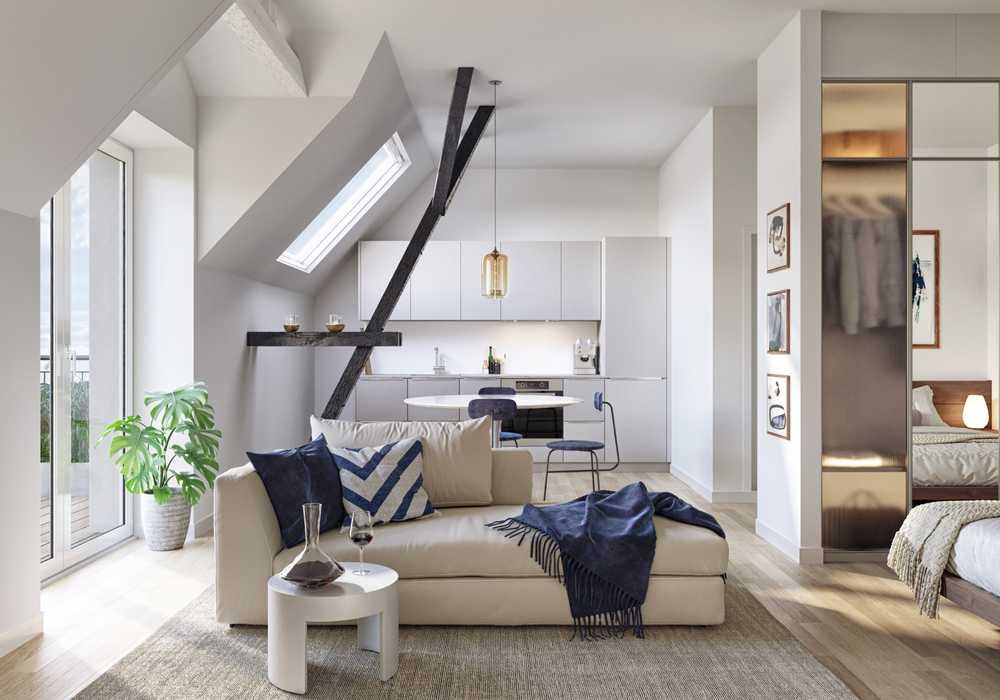 In Rüdesheim am Rhein entsteht zur Zeit an einem historischen Standort, im Ensemble Haus von Beckerath, ein Wohnkomplex, der seinen Bewohnern einzigartigen Wohnkomfort in einer der schönsten Regionen Deutschlands bietet. Ab sofort können Sie eine der 26 individuellen Eigentumswohnungen erwerben, zum Beispiel diese kompakte Studiowohnung, die durch eine perfekte Planung besticht. Der Wohn-Ess-Schlafbereich ist gut strukturiert und wirkt durch verkleidete Dachschrägen und eine lichte Raumhöhe von ca. 5,80m sehr gemütlich. Von hier aus gelangen Sie direkt zum schönen Balkon mit Südausrichtung. Die individuell geplante moderne Einbauküche ergänzt das Angebot. Die auf jede Wohnung zugeschnittene Lichtplanung unterstreicht den Wohlfühlcharakter. Zur Wohnung gehört auch ein separater Abstellraum. Ein parkähnlicher Gartenbereich auf dem Grundstück lädt die Bewohner des Hauses von Beckerath zum Verweilen ein. Die Fußbodenheizung der Wohnung wird energieeffizient aus einer Kombination zwischen Luft-Wasser-Wärmepumpe und Kraft-Wärme-Kopplungsanlage betrieben. Sie können die Wohnung sowie einen Außenstellplatz oder einen Stellplatz in der Garage, auch mit zusätzlicher E-Ladestation, provisionsfrei erwerben. Eine Paketstation ist für die Bewohner vorgesehen. Weitere Informationen unter haus-von-beckerath.de