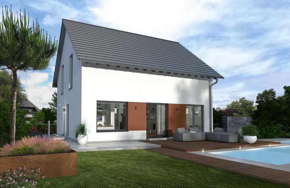 Zeitlose Eleganz außen, Weite und ein besonderes Raumgefühl innen. Unter dem Satteldach warten hier rund 135 m² auf zwei Ebenen darauf, bezogen und mit Leben gefüllt zu werden. Im Erdgeschoss ist Offenheit Trumpf: Hier erstreckt sich der große Wohn-Ess-Koch-Bereich nahezu über die gesamte Ebene, er wird nur durch die zentral platzierte Treppe von der Diele abgetrennt. Das Ergebnis: ein lichtdurchfluteter, einladender und großzügiger Bereich zum Wohlfühlen und Treffen. Im Eingangsbereich stehen zudem ein kleines Gäste-WC sowie ein großer Hauswirtschaftsraum zur Verfügung. Über die mittig gelegene Treppe geht es ins Obergeschoss. Hier ist ausreichend Raum für Eltern und bis zu zwei Kinder. Die Eltern verfügen über ein großzügig geschnittenes Reich mit separatem Ankleideraum, zwei große Kinderzimmer lassen ebenfalls keine Wünsche offen. Abgerundet wird das Raumangebot in der oberen Etage durch ein großes Badezimmer mit Dusche, Wanne und WC.