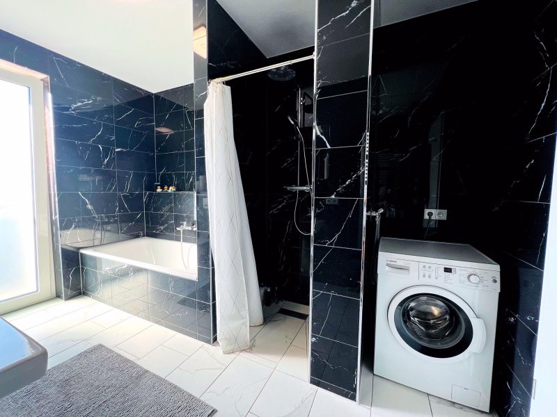 • Komfortable Bäder mit Badewanne und bodengleich gefliestem Duschbereich, Handtuchheizkörper und Hochwertige Sanitärobjekte.