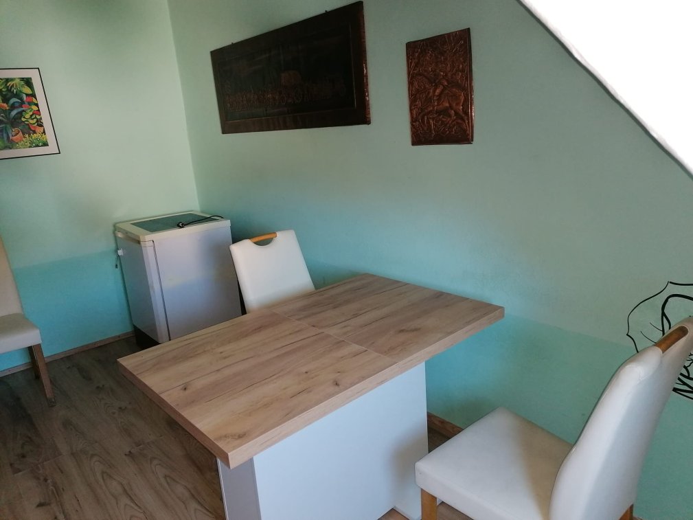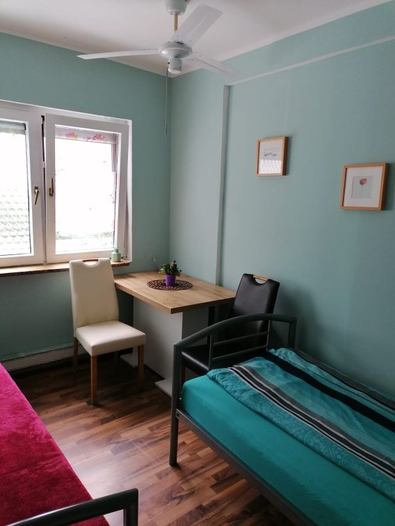 Das Haus wurde 1973 gebaut. Im Erdgeschoss war früher ein Restaurant. Jetzt diese und oberste Wohnung nutzen wir als Monteurzimmer. Im Moment sind 3 Zimmer vermietet, wohnen 3 Herren. Im 1. OG wohnen wir selbst. Dort befindet sich ein Balkon, den haben wir in ein kleines Zimmer umgebaut. Im Keller in einem Raum befinden sich Öltanks, der 2. Raum wurde in eine Gastro-Küche umgestaltet und für griechischen Lieferservice genutzt. 3.Raum ist Aufenthaltsraum.