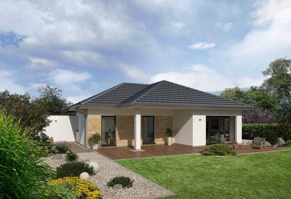 Der Winkelbungalow als Fertighaus präsentiert eine Architektur, die sowohl Modernität als auch Sicherheit verkörpert. Dank seiner besonderen Bauweise bietet dieser Entwurf eine gemütliche überdachte Terrasse, die als perfekter Rückzugsort dient und bei nahezu jedem Wetter Schutz bietet. Die Terrassentüren verleihen dem Wohnzimmer Charme und schaffen eine Verbindung zwischen Wohnbereich, Garten und Terrasse. Der Winkelbungalow erfreut sich großer Beliebtheit aufgrund seiner durchdachten Bauform. Der großzügige Wohn-/Ess- und Kochbereich bietet viel Platz für Entfaltung. Durch die Terrassentüren gelangt man direkt von der Küche und dem Essbereich auf die Terrasse und in den Garten. Ein geräumiges Schlafzimmer mit Zugang zur Terrasse, ein komfortables Bad, optional mit Wanne und Dusche, sowie ein zusätzlicher Raum, der als Büro, Kinder-/Gäste- oder Hobbyraum genutzt werden kann, komplettieren das Angebot. Die durchdachte Raumplanung des Winkelbungalows als Fertighaus gewährleistet einen hohen Wohnkomfort und kurze Wege.