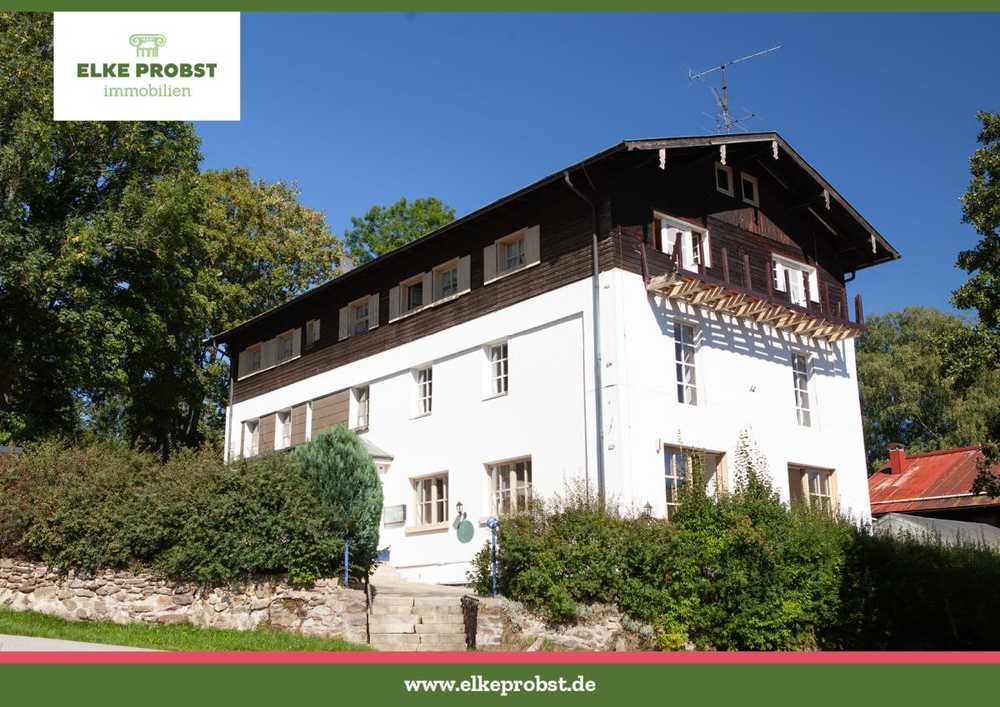 Der gigantische Ausblick zum Arber ist nur einer der Vorzüge dieses Hauses. Es zeichnet sich vor allem durch die Größe und Flexibilität der verschiedenen Räume aus. Ureinst einmal Kirche gewesen, diente das Gebäude auch als beliebtes Hotel mit Restaurant. Eine Großfamilie wohnte hier zuletzt und kreiierte ein äußerst modulares Refugium. So könnte sich hier die Wohngemeinschaft ausleben, denn immerhin beherbergt das Haus elf Zimmer mit drei Küchen und fünf Bäder. Für fünf Familien gäbe es somit genug Platz. Auch eine gewerbliche oder gastronomische Nutzung ist durchaus denkbar, denn im Erdgeschoss findet man noch den riesigen ehemaligen Gastraum mit der professionellen Küche und den Toiletten vor. Etliche Wohnbereiche haben Ausgänge zu den Terrassen und in den Garten sowie aus den Balkonen. Der Garten mit kleineren Nebengebäuden bietet beschauliche Bereiche unter einem alten Baumbestand an. Vor dem Haus befinden sich genügend Parkplätze mit einem doppelten Carport. Einige Stellen bedürfen noch Sanierungen und auch Renovierungen. Jedoch die gute alte Bausubstanz trägt sehr zur Gemütlichkeit bei. Der Ort Bayerisch Eisenstein hat sich als Erholungs- und als Luftkurort ein Zeichen gesetzt. So hat man hier Läden für den täglichen Bedarf, einen Arzt und eine gute Anbindung mit der Waldbahn oder dem Bus zu den Schulen in Zwiesel und in die Kreisstadt Regen. Die Ortsmitte befindet sich noch im Fußwegbereich,