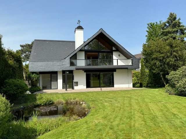 Willkommen in Ihrem Traumhaus! Dieses herausragende Architektenhaus vereint großzügigen Wohnkomfort und erstklassige Lage mit einem unverbaubaren Weitblick ins Grüne. Die Vorderansicht besticht durch gediegenes Understatement.