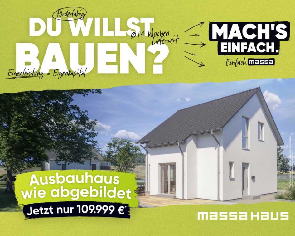 Die eigenen vier Wände? Der eigene Gemüsegarten gleich hinterm Haus? Die eigene Garage für das Familienauto? Hören Sie auf zu träumen und verwirklichen Sie sich Ihren Wunsch vom Haus mit uns - dem Marktführer unter den Ausbauhausherstellern Deutschlands. Entscheiden Sie sich für unser Angebotshaus inklusive Grundstück zu einem unschlagbaren Preis! Dieses projektierte Niedrigenergie-Einfamilienhaus besticht durch eine großzügige Wohnfläche und eine Ausführung nach dem neusten Stand der Technik, die auch die Anforderungen der aktuellen Energieeinsparverordnung erfüllt. Sie als Bauherr können Ihr neues Eigenheim individuell gestalten und somit Ihre eigenen Wohnideen mit einbringen - von der Raumaufteilung bis hin zur Farbgestaltung. Bei Massa-Haus erwartet Sie Hausbau aus einer Hand - wir unterstützen Sie bei der Grundstückssuche und allen Fragen zur Finanzierung. Gemeinsam gehen wir den Weg in Ihre eigenen vier Wände.