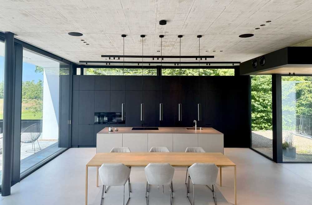 Im Haus harmonieren die perfekten Materialien wie Beton, Glas und Eiche. Minimalismus und Perfektion in seiner höchsten Form.