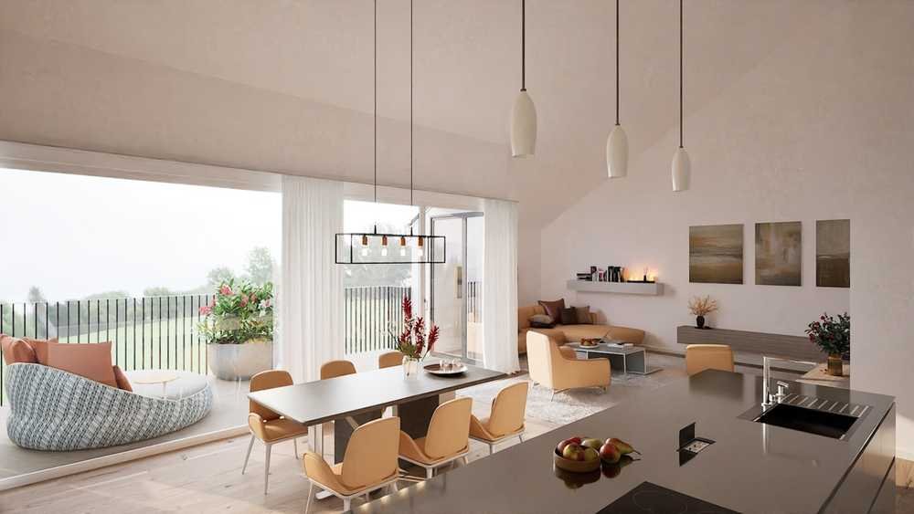 Dieses einladende Zuhause, bestehend aus zwei architektonisch ansprechenden Baukörpern, die insgesamt 16 attraktive Wohndomicile beherbergen. Herzstück der beiden miteinander verbundenen Häuser bildet die Gemeinschaftszone im Erdgeschoss. Sie stellt zum einen den Hauptzugangsbereich dar und fungiert zugleich als Begegnungsort für die Bewohner.