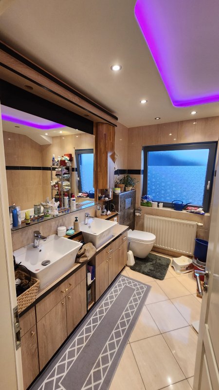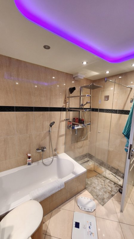 - Erdgeschoss: Diele, L-förmige Wohnesszimmer, Küche, ein großes und ein kleineres Zimmer, Badezimmer mit Badewanne, zwei Waschbecken, WC, Regendusche und Gäste-WC