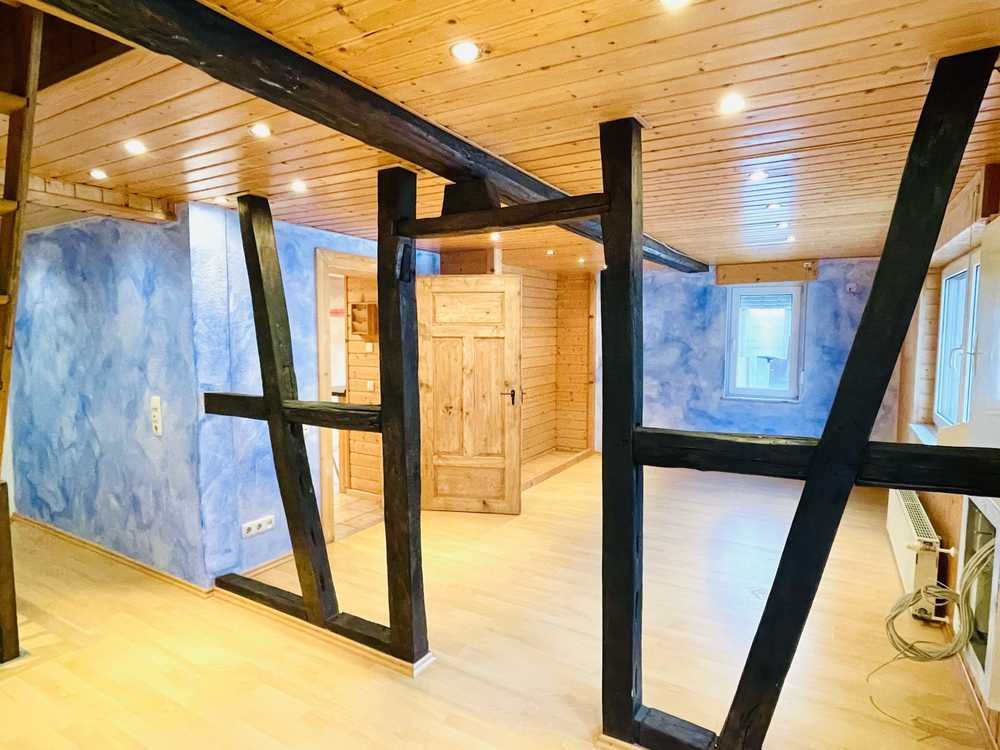 Auf der anderen Seite trennt offenes Fachwerk den Flur von Wohn- und Esszimmer. Ebenso bestimmen wieder das angenehme Licht und die Holzverkleidung die heimelige Stimmung. An das Zimmer schließt sich die Küche an, die im gleichen Stil gehalten ist.