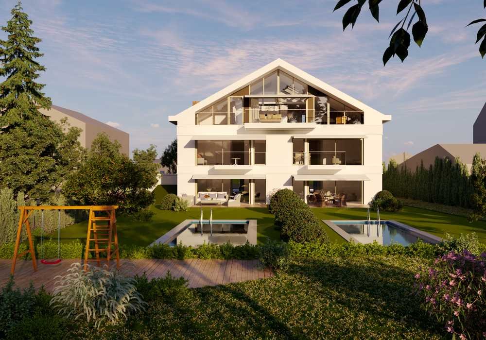 In der Lakeside-Villa genießen Sie nicht nur einen wundervollen Blick auf den See und den großen Garten mit dem alten Baumbestand, sondern profitieren auch von einer unverbauten Sicht ins Grüne. Der moderne Grundriss ermöglicht einen direkten Zugang zum großzügigen Garten und schafft eine Verbindung zwischen Innen- und Außenraum, die ihresgleichen sucht. Die Terrassen- und Gartenflächen sind so geplant, dass sie die Bewohner einladen, die Natur in vollen Zügen zu erleben.
