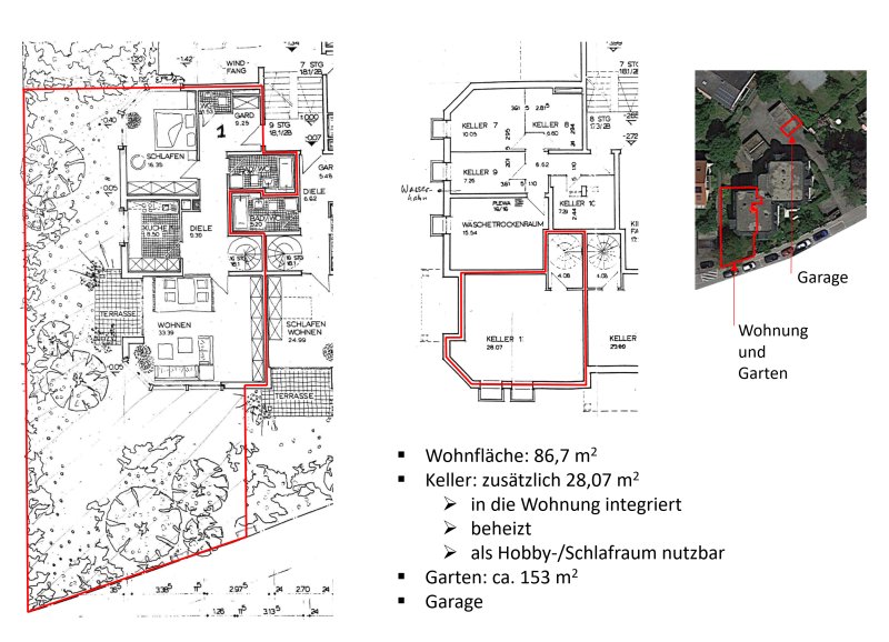Zur Wohnung gehört eine Einzelgarage, die sich wenige Meter von der Haustür entfernt auf dem Gemeinschaftsgrundstück befindet.