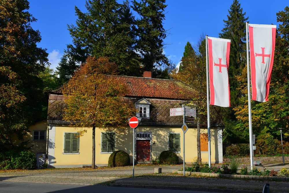 Das aufstehende Gebäude ist das ehemalige Gärtner-/ Verwaltungsgebäude der Schloßanlage.