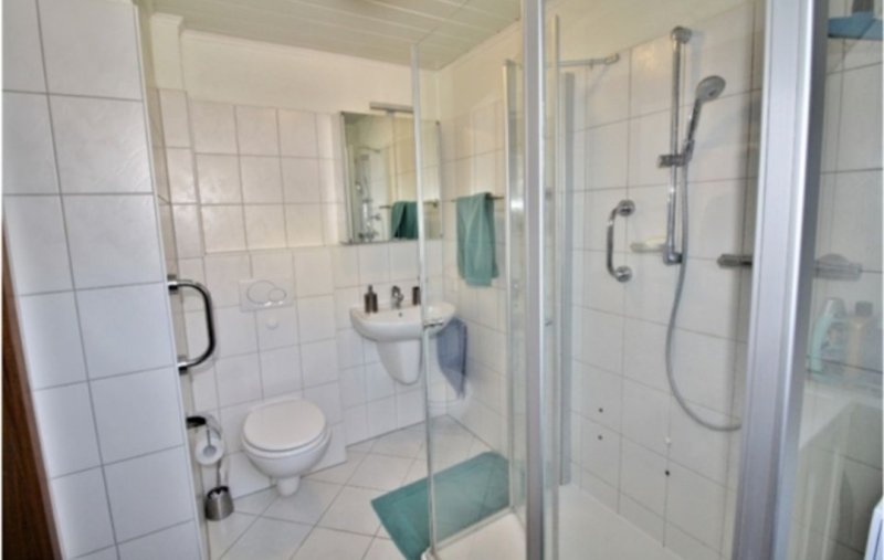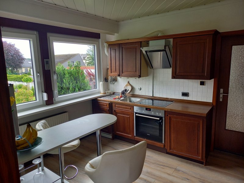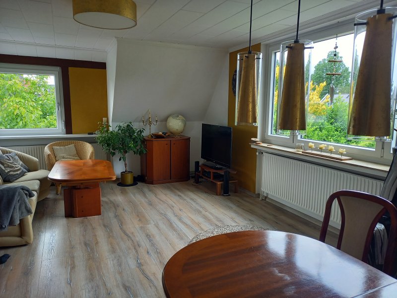 Der überdachte Wohnungseingang befindet sich neben den beiden Garagen im hinteren Bereich der Auffahrt. Im großzügigen Eingangsbereich befinden sich viele Einbauschränke und eine breite Holztreppe, die zur Wohnung im Obergeschoss führt. Die Wohnung besitzt eine Wohnfläche von ca. 77m². Vom Flur im Obergeschoss aus gelangt man in die nach Osten ausgerichtete Küche, in das 2010 modernisierte Badezimmer mit Veluxfenster und das Schlafzimmer. Hinter der Küche befindet sich das ca. 25m² große Wohnzimmer mit einer breiten Fensterfront mit Blick in den eigenen Garten. Der Spitzboden, der ebenfalls vom Flur über eine fest installierte Treppe erreicht wird, bietet viel Stauraum oder kann auch bei Verbesserung der Dämmung als weiterer Wohnraum genutzt werden.