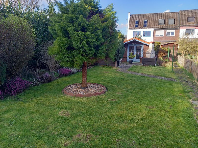 Die Außenanlage bietet neben Rasenflächen und liebevoll angelegten Beeten ein hochwertiges Gartenhaus mit Satellitenschüssel und Sitzgarnitur. Davor lädt eine Terrasse mit Steinofen zum Grillen ein.