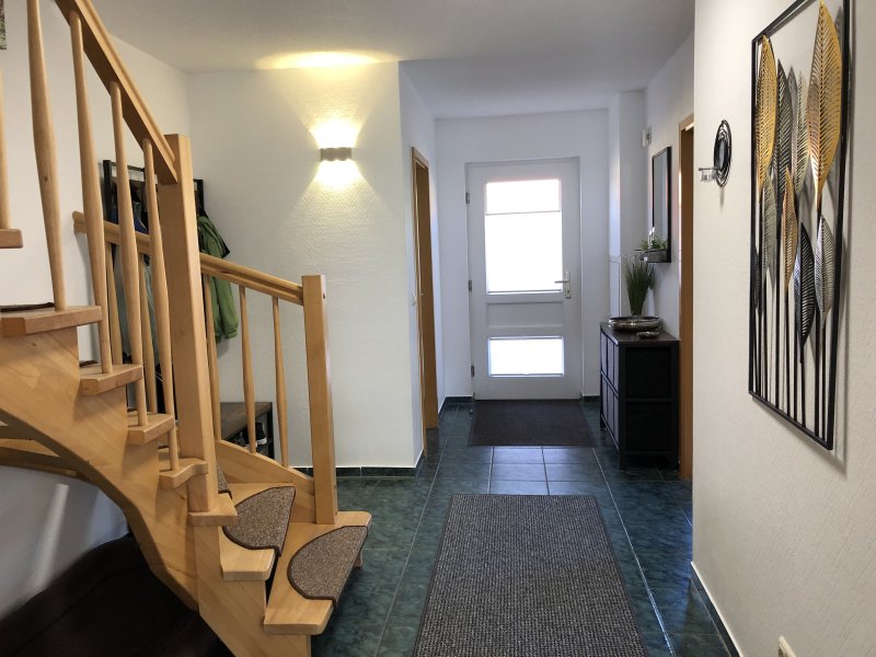 Im Erdgeschoss gelangt man vom großzügig geschnittenen Flur in das geräumige Wohnzimmer mit Ausgang zum Garten mit Terrasse. Auch die Küche und das Gäste-WC sind direkt vom Flur aus zugänglich.