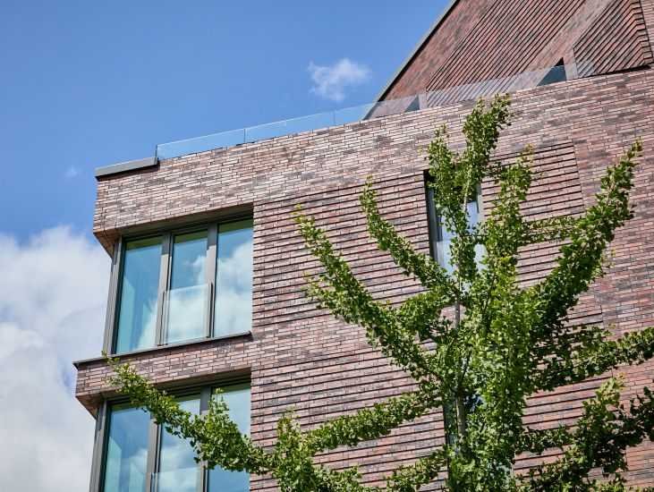 Die Architektursprache der Guten Stube Altona ist modern, urban und einfach passend zu Hamburg. Die straßenseitigen Fassaden orientieren sich an dem Hamburg typischen Backsteinexpressionismus des letzten Jahrhunderts und übersetzen das Bauen der 1920er Jahre in ein schönes Stück zeitgenössische Architektur. Ziegelriemchen mit teilweise horizontal vorstehenden Steinreihen gliedern die vordere Front und verleihen der Fassade, zusammen mit den grafisch gegliederten, verglasten Loggien, eine entspannte Lebendigkeit. Ein großzügiger, auskragender Erker setzt einen markanten, städtebaulichen Akzent. So wirkt die Gute Stube Altona so, als ob Sie schon immer dagewesen wäre.