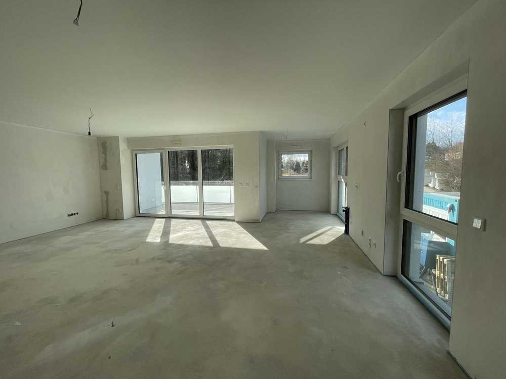 Zu linker Hand befindet sich der geräumige Wohnbereich mit angrenzender, offener Küche und Loggia.