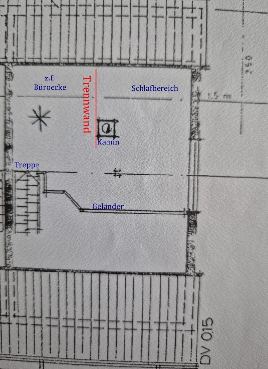 Im Oberen Bereich ist die Aufteilung der Räume ebenfalls gelungen. Auf der einen Seite kann man sich beispielsweise ein kleines Büro einrichten, auf der anderen Seite befindet sich der Schlafbereich. Diese sind aktuell durch eine Trennwand voneinander getrennt, diese lässt sich aber problemlos entfernen.
