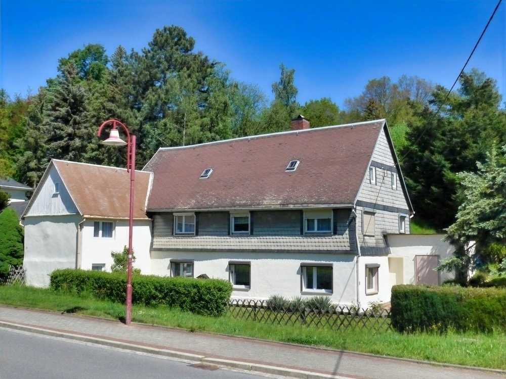 Das um 1730 errichtete Fachwerkhaus mit späterem Anbau steht lt. Denkmalschutzkarte nicht unter Denkmalschutz. Durch die Hanglage bedingt, befindet sich der EG-Bereich teilweise im Erdreich und das OG verfügt über einen direkten Zugang zum Garten. Typisch für ein Haus aus dieser Zeit sind die vor allem in der oberen Wohnebene eingeschränkten Deckenhöhen um die 2 Meter. Im EG mit dem separaten Treppenhaus, zwei WCs und dem Heizungsraum steht eine abgeschlossene, bis vor kurzem bewohnte Wohnung zur Verfügung. Von deren Flur erreichen Sie das Schlafzimmer, die Küche und das Bad. An der Küche schließt sich praktisch das Wohnzimmer an. Vom Bad aus ist ein kleiner kellerähnlicher Raum zugänglich. Im schon länger nicht mehr genutzten OG existieren der Hausflur mit Zugang zu mehreren Zimmern mit Durchgangsräumen, ehemaligen Küchen und einem einfachen Bad mit Dusche. Im großen Dachbodenbereich sind noch Teile aus der Bauzeit sichtbar. Das Gebäude verfügt über eine bauzeittypische Grundsubstanz mit gemauerten Wänden und Fachwerk. Nach der Dacheindeckung mit Pappschindeln ca. 1995 folgte ca. 1998 der Duschbadeinbau im Obergeschoss, ca. 2011 Wechsel der Fenster, 2015 die Herstellung der vollbiologischen Kläranlage, 2021 die Badmodernisierung im Erdgeschoss und der Einbau einer neuen Heiztherme. Es besteht weiterer Sanierungsbedarf, u. a. Böden, Türen, Dämmung, ELT usw. Das ca. 1.370 m² große, nach hinten ansteigende Grundstück ist zusätzlich mit Nebengelassen und einer Garage bebaut.