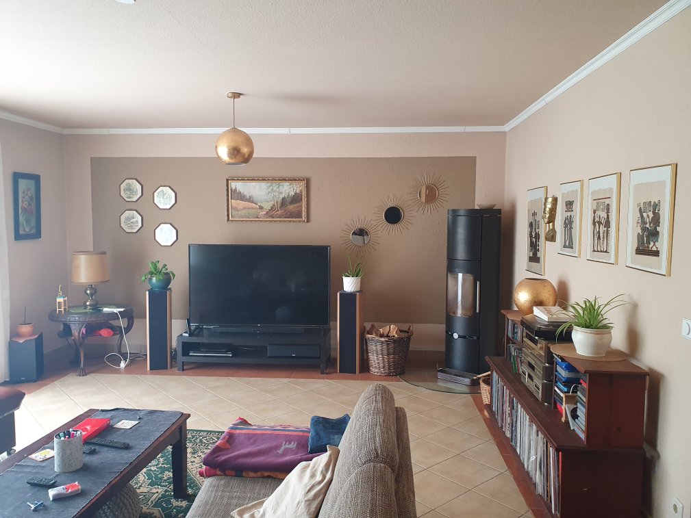 Über die Diele mit offener Treppe gelangt man in die geräumige Wohnküche, das Gäste WC und das große Wohnzimmer mit Kamin. Mit dem Kamin ist das gesamte Haus beheizbar, zusätzlich kann mit der Fußbodenheizung nachgearbeitet werden. Durch das Wohnzimmer erreicht man die großzügige Terrasse. Im Erdgeschoß sind alle Böden gefliest.