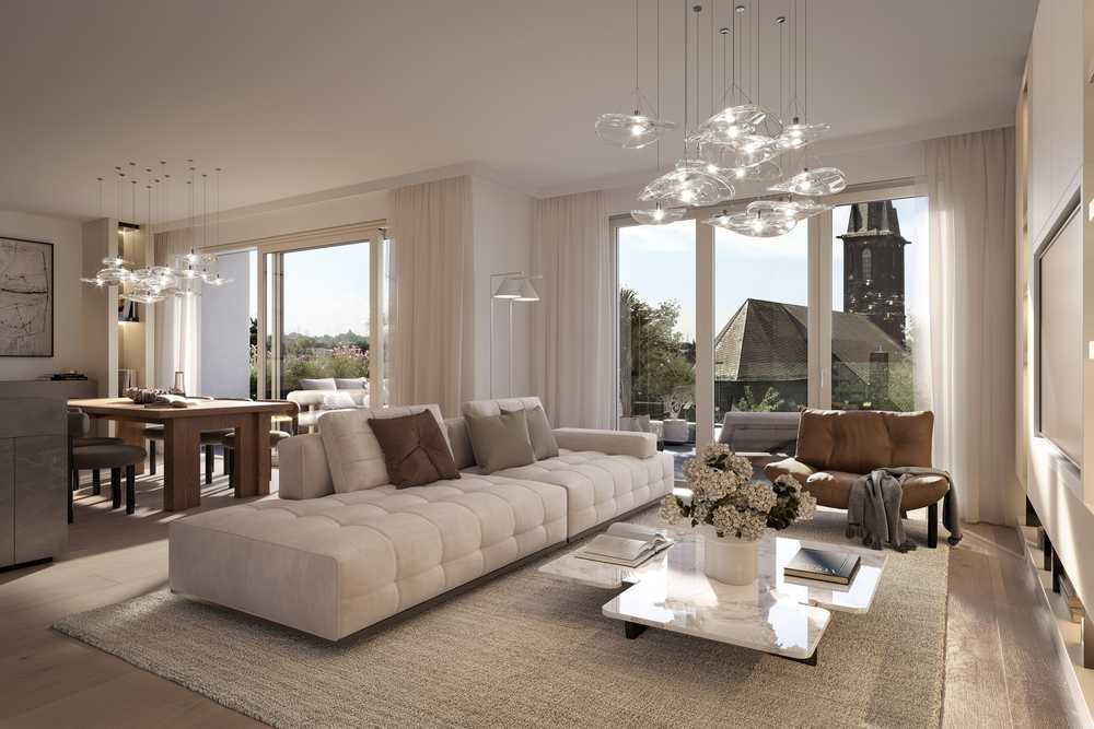 An der Diele liegt das Schlafzimmer mit doppelflügeligem, bodentiefem Fenster und direkt daneben das Duschbad. Dieser private Bereich ist von der großen Wohnlandschaft separiert, die sich linker Hand des Eingangs für Bewohner und Besucher öffnet: Ihre 50,41 m2 bilden eine Einheit, in der die Küche mit freistehender Kochinsel, das Esszimmer und das Wohnzimmer ihre eigenen Bereiche einnehmen. Die Terrasse von fast 28 m2 Größe liegt nach Süden ausgerichtet und kann über eine große Schiebetür sowie eine Terrassentür betreten werden. Die bodentiefen Fenster machen sie zu einem Teil des Wohnraums – als privater Sonnenplatz, uneinsehbar für die Nachbarschaft.