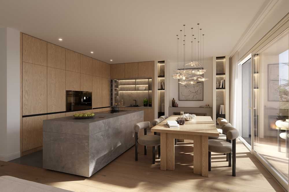 Die 49,18 m2 große Wohnlandschaft wird an zwei Seiten von den bodentiefen Terrassenfenstern eingefasst und macht die Aussicht bis zum Horizont zu einem Teil des Wohnraums. Über mehr als 75 m2 Freifläche mit Süd-West-Ausrichtung verfügt das Penthouse zum Sonnenbaden oder für Nächte unter dem Sternenhimmel. Der benachbarte Essbereich mit offener Küche und freistehender Kochinsel ist die überdachte Alternative.